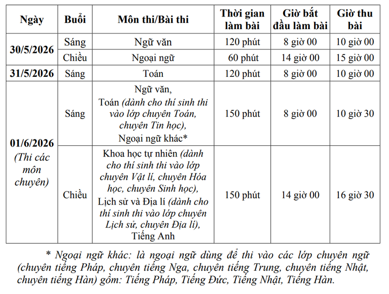 Theo đó, kỳ thi diễn ra vào hai ngày 30, 31/5 với ba môn Toán, Văn và Ngoại ngữ (chủ yếu là Tiếng Anh). Học sinh thi vào một trong bốn trường chuyên Hà Nội - Amsterdam, Nguyễn Huệ, Chu Văn An, Sơn Tây sẽ thi thêm môn chuyên vào ngày 1/6.